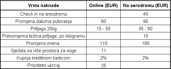 Kupnja karata je obavljena, dobivena je izrazito niska cijena karte, no treba imati na umu da ta cijena uključuje samo prijevoz osobe avionom od točke A do točke B, te prijevoz male količine prtljage. Ostale usluge se dodatno naplaćuju. Potrebno je dobro proučiti što se mora napraviti, kako bi se izbjegli dodatni troškovi. Najčešće niskotarifne kompanije zahtjevaju da putnici naprave prijavu za let (check in) online, te da ispišu svoju ukrcajnu propusnicu ili da preuzmu istu na mobilnom telefonu. Ukoliko to zaboravite napraviti, aviokompanija će vam prijavu za let dodatno naplatiti. Volite li sjediti uz prozor i promatrati kuda letite, odnosno želite sjediti uz prolaz, na mjestima gdje ima više mjesta za noge ili na početku aviona, odabir sjedala također morate dodatno platiti.Ako ste putovali sa nekog aerodroma i znadete da je često velika gužva na sigurnosnim pregledima, aviokompanije će vam ponuditi uz određeni iznos mogućnost da koristite brze prolaze, kako bi si smanjili vrijeme čekanja. Ukoliko želite biti među prvim putnicima koji će se ukrcati u avion, te time lakše pronaći mjesto za svoju ručnu prtljagu, naravno i to trebate dodatno platiti. Hrana i piće u avionu se također naplaćuju, te je i najobičniju čašu vode potrebno platiti.