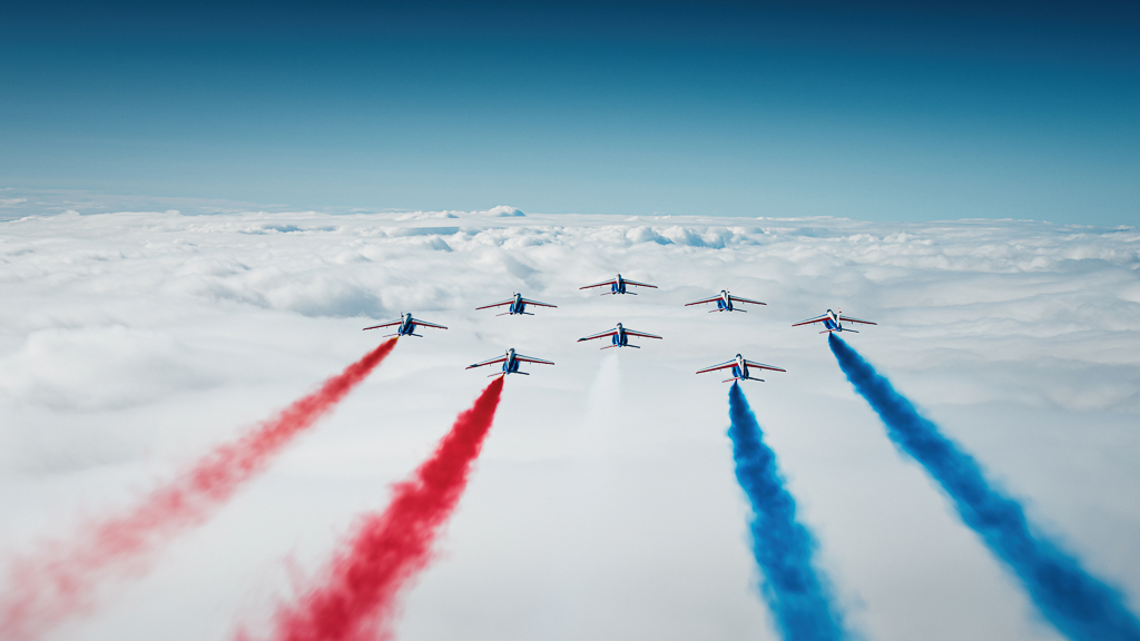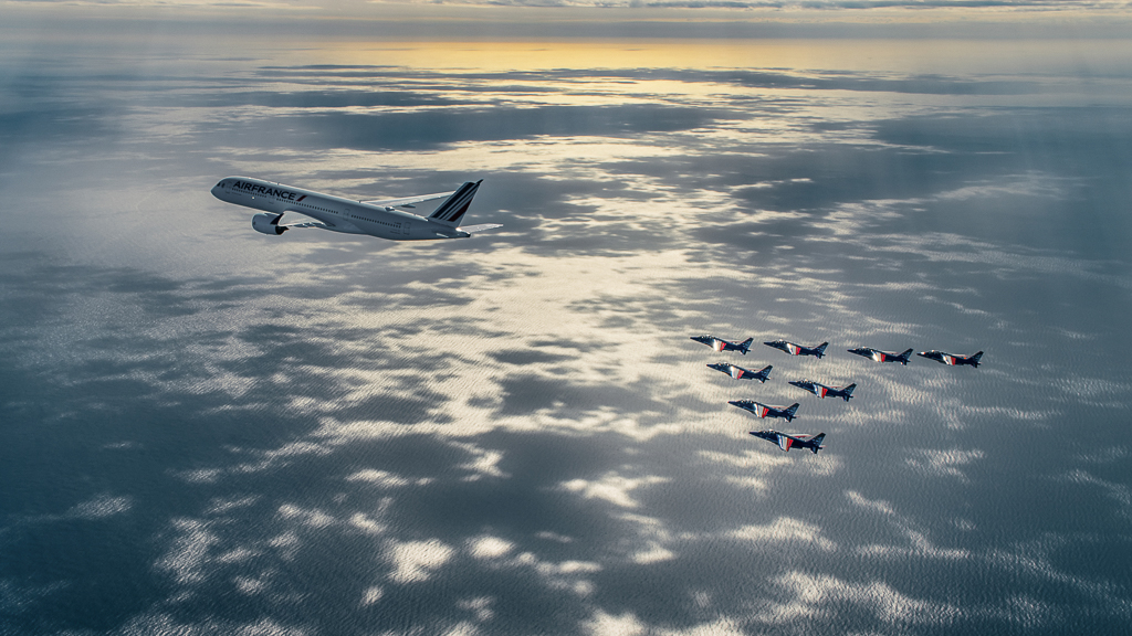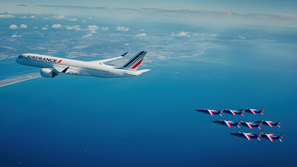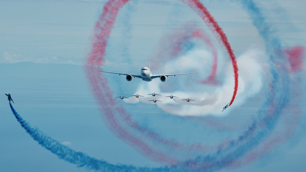 Krajem rujna 2023., Air France je preuzeo svoj 22. zrakoplov Airbus A350-900 i letio ga prema novom mu domu u zračnoj luci Paris Charles de Gaulle. Povodom tog događaja, piloti Alphajetova Patrouille de Francea također su odrađivali premještanje u regiju Occitanie kako bi sudjelovali u airshowu. Pripreme za balet u zraku trajale su jedan mjesec tijekom kojeg je bilo potrebno razraditi sve do najsitnijeg detalja kako bi ovaj let od 45 minuta prošao uz najveće sigurnosne standarde. Njihov susret je sniman na visini preko 2.500 metara iznad regije Camarugue.