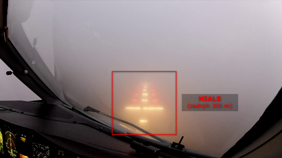 Prva svjetla s kojima se posada susreće na prilazu su Approach Lights (APL), sustav svjetala koji uobičajeno počinje 900 metara prije praga staze te, u uvjetima smanjene vidljivosti, posadi daje vizualnu referencu potrebnu za nastavak prilaza (tj. dok ne ugledaju samu stazu ili njena svjetla). Konfiguracija i maksimalni intenzitet APL-a ovisi o najpreciznijem sustavu za instrumentalno prilaženje koji je dostupan na toj stazi: u ovom slučaju, riječ je o CAT II/III High Intensity Approach Lighting System (HIALS) koji je prikladan za operacije pri horizontalnoj vidljivosti manjoj od 500 metara.