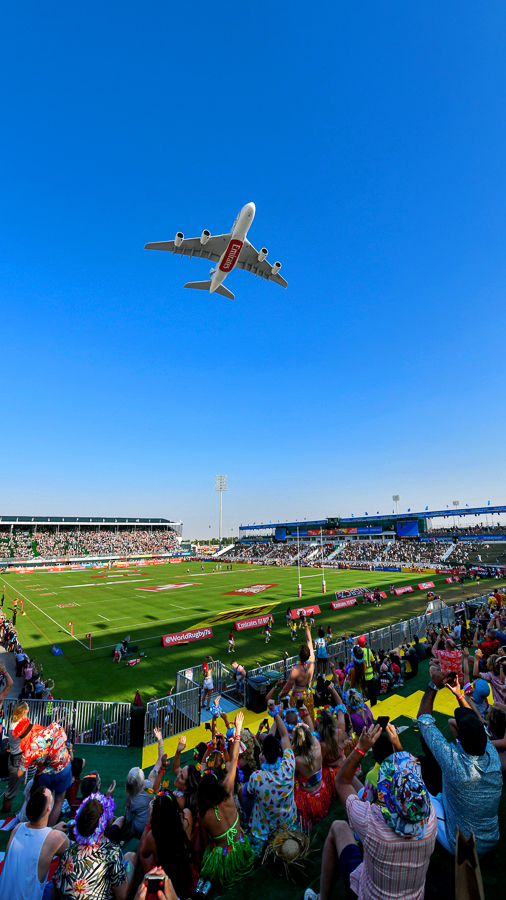 Tisuće navijača na ragbi utakmici na The Sevens Stadium mogle su uživati u niskom preletu Emiratesova zrakoplova Airbus A380 koji je ukrašen posebnim bojanjem u slavu 50 godina Ujedinjenih Arapskih Emirata (UAE). Zbog zlatne obljetnice UAE-a, broj 50 na zrakoplovu je zlatno obojan.