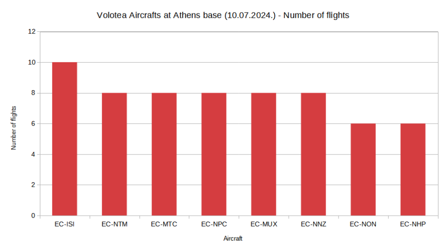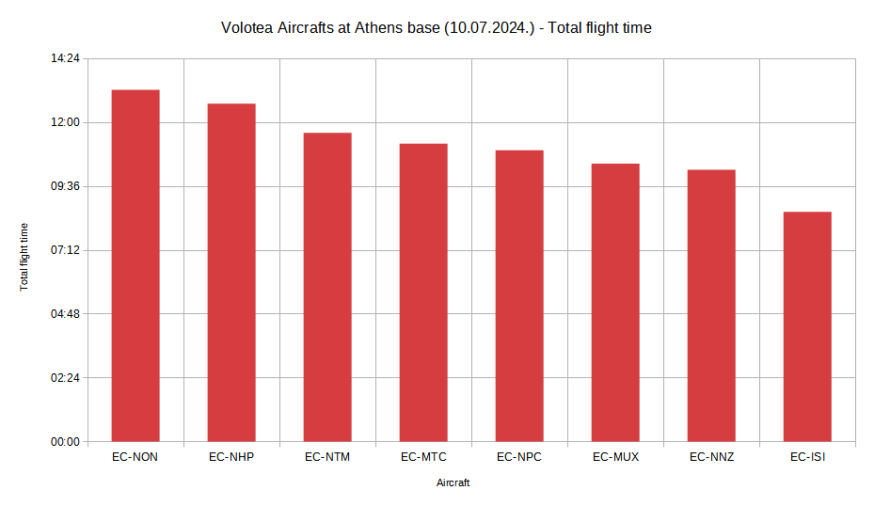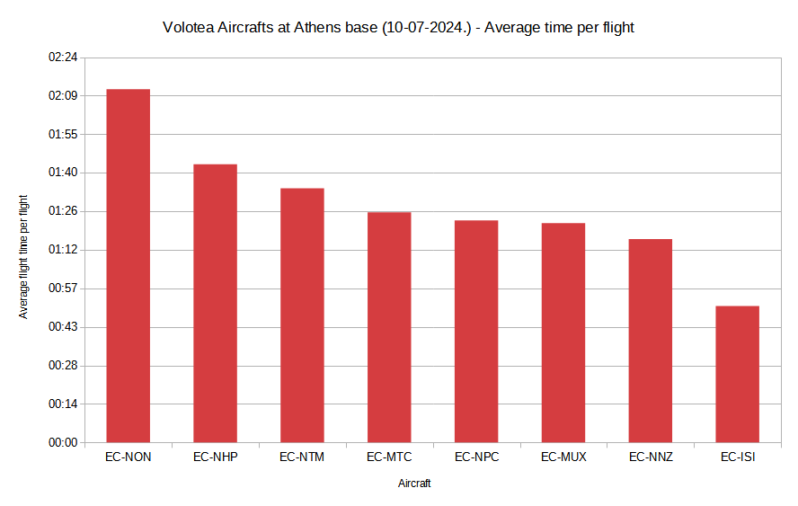 On 10 July 2024, each Volotea aircraft at the Athens base flew an average of around 11 hours. EC-NON flew the most due to its long flights, while EC-ISI flew the least because of its short flights from Athens to the Greek islands. Another aircraft based in Athens, EC-NTM, flew significantly more than EC-ISI due to its longer flights, with an average flight duration of 1 hour and 35 minutes.