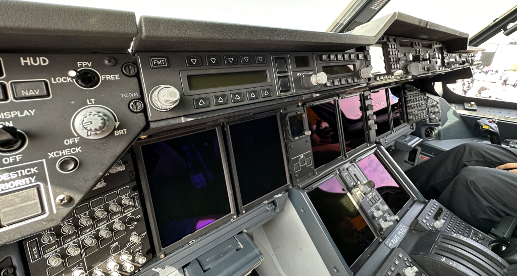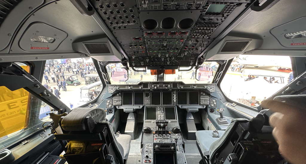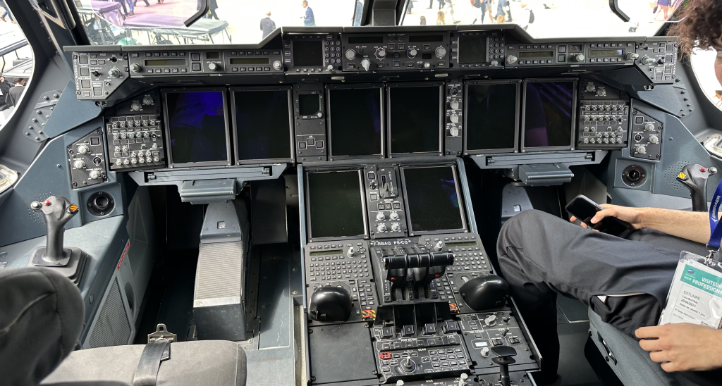 After visiting the cargo area, we climbed the ladder into the cockpit. The cockpit you probably imagine is cramped, but this is anything but such. A group of 10 visitors fit comfortably in the cockpit of the A400, we all even had a place to sit. The cockpit is otherwise based on the architecture of the A380 cockpit, with certain changes due to the type of engine (turboprop versus jet), as well as due to the purpose itself and the different nature of flight operations. Visibility from the cockpit, which is located literally on top of the plane, is excellent, and such a spacious cockpit truly positively affects the feeling you get from staying in this, as some members of the group called it, flying factory.