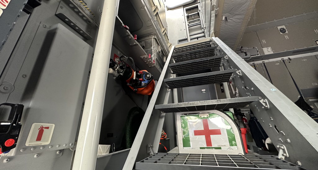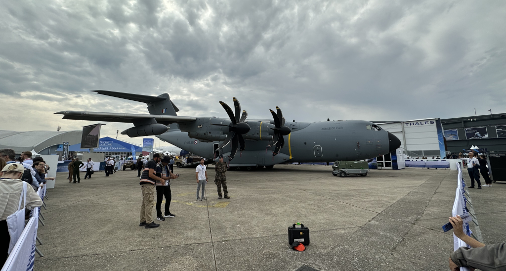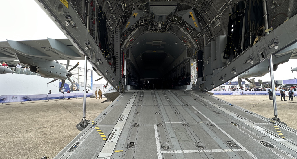 First, we decided to look at the Airbus A400M, which, with its appearance and central position, dominates the static display of LeBourget. Before entering the plane, we received a detailed presentation of the plane itself. The French pilots on the A400 have given their best to explain everything about the aircraft, including statistics, performance, purpose, range, etc. Once you see the interior of the A400, I think it’s impossible not to wonder how this thing flies. The huge space provided for various cargo somewhat “kills” the feeling that you are in a plane at all, but rather in a warehouse. The space is equipped on both sides with “seats”, or better said folding benches that are more reminiscent of seating nets. It was interesting to see the Airbus details that we usually see in passenger planes in this kind of military variant.