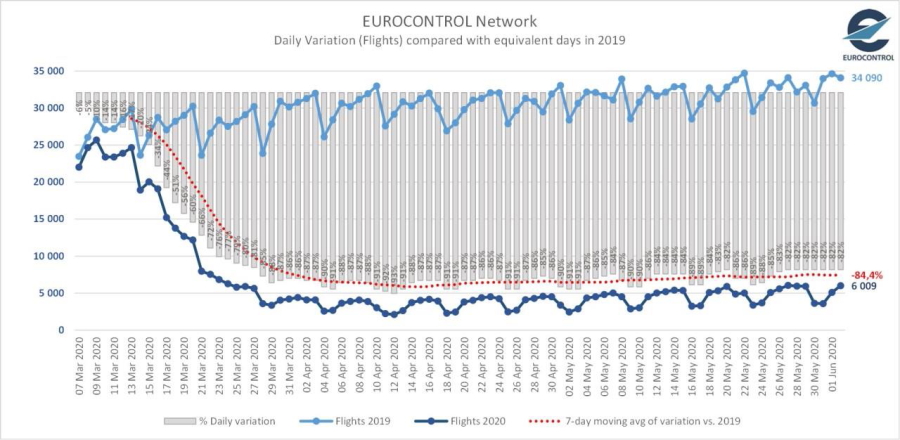 As of June 2, 2019, Eurocontrol recorded 34,090 flights, while this year there were 6,009 flights on that day, which is only 15.6% of last year’s number.