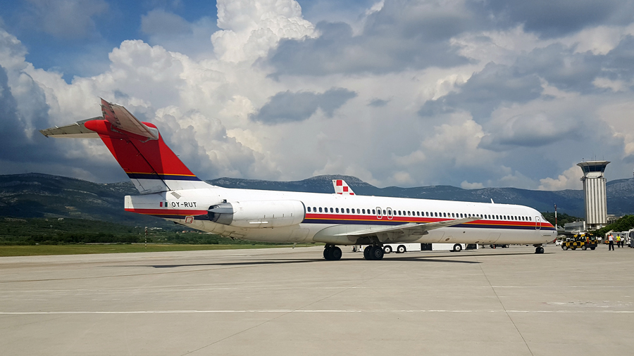 Danski zračni prijevoznik DAT Danish Air Transport (DX/DTR) doletio je u četvrtak na charter liniji iz Stockholma (zračna luka „Arlanda“) preko poljskih Katowica u Split. Doletio je sa starijim zrakoplovom McDonnell Douglas MD-82 (na slici dolje). To je bio prvi let ovog zrakoplova za danskog prijevoznika koji je ovaj zrakoplov preuzeo tek 5. svibnja od talijanskog prijevoznika Meridiana (IG/ISS) čije bojanje bez naziva tvrtke ovaj zrakoplov i dalje nosi. Zrakoplov je u četvrtak preletio u Zadar gdje je bio parkiran do povratka svoje skupine turista u nedjelju natrag iz Splita prema Poljskoj i Švedskoj.