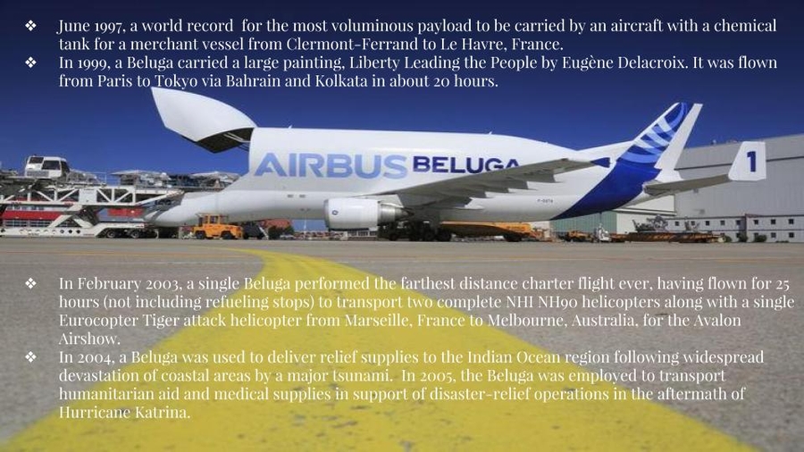 Beluga može prenositi krila zrakoplova A340 , dijelove Airbusa A350, te neke komponente A380 . Ipak, nije dovoljno velik za prijevoz svih dijelova trupa za A380 , pa se većina dijelova za taj tip zrakoplova i dalje prevoze brodom i kopnenim putem.