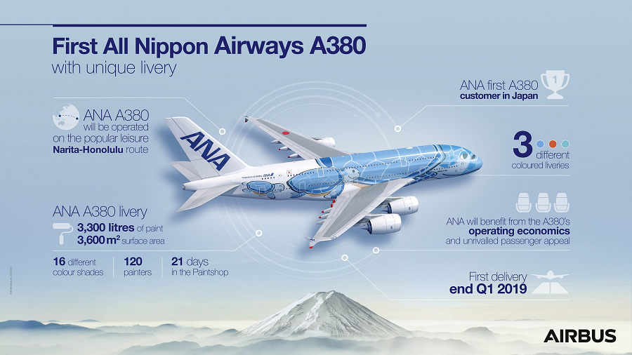 ANA ima tri naručena zrakoplova Airbus A380, prvi zrakoplov će biti isporučen u prvom kvartalu 2019. godine i letjet će na popularnoj ruti Tokyo Narita – Honolulu (Hawaii).