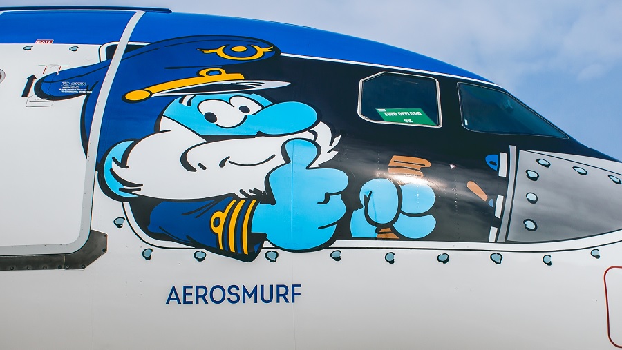 Štrumpfovi ove godine slave 60 godina te je povodom tog slavlja Brussels Airlines odlučio obojati jedan svoj zrakoplov u posebne boje. Sedam mjeseci, 1.415 potencijalnih zamisli kako obojati zrakoplov i 14 dana bojanja. Na bojanje zrakoplova 14 radnika je utrošilo 2.100 radnih sati i 420 litara boje. To je ukratko opis štrumpf projekta Brussels Airlinesa. Ovo je njihov peti zrakoplov u posebnom bojanju koji će nositi belgijske boje diljem Europe i šire. Dizajn talijanke Marte Mascellani odabran je od strane javnosti kao najbolji te je ekipa iz Peyo studija prilagodila Martin dizajn zrakoplovu. Rezultat je zrakoplov s 19 štrumpfova. U pilotskoj kabini zrakoplova sjede Štrumpfeta kao kapetan i Papa Štrumpf kao kopilot. Od ostalih Štrumpfova, tu je Svirko koji svira belgijsku himnu na saksofonu, štrumpf kabinsko osoblje koje poslužuje vafle i pržene krumpiriće te, naravno, i neizostavni Azrijel i Gargamel koji pokušavaju pobjeći iz zrakoplova, No, njih dvojicu ćete primjetiti tek kada je zrakoplov u zraku jer se njihov crtež nalazi na donjem dijelu zrakoplova. Putnici u zrakoplovu će također uživati u štrumpf doživljaju u kabini, od njihovih otisaka nogu na tepihu, crtežu na pojedinim dijelovima kabine te glazbi na temu štrumpfova. Aerosmurf zrakoplov nosi registraciju OO-SND, a svoj prvi let je odradio na ruti Brisel – London na letu SN2093. Prema Brussels Airlinesu, ovaj zrakoplov će nositi to bojanje do 2023. godine. Naziv Aerosmurf je ovaj zrakoplov dobio prema naslovu stripa u kojemu štrumpf sanja o letu. Mali štrumpf je iskušao nekoliko zamisli, ali niti jedna od njih ga nije vinula u visine. No, na kraju je uspio izraditi zrakoplov koji je dobio ime Aerosmurf.
