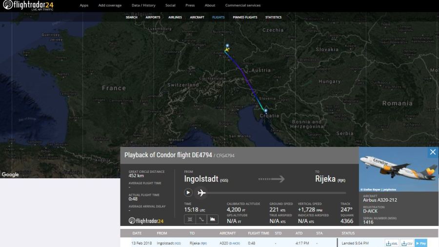 Na zračnoj luci Rijeka u srijedu, 14. veljače, imao je trenažne letove zrakoplov tipa Airbus A320 reg. oz. D-AICK njemačkog zračnog prijevoznika Condor (DE/CFG). Doletio je dan ranije, 13. veljače, sa zračne luke u južnonjemačkom Ingolstadtu. Zračna luka Ingolstadt – Manching inače nema redovitih linija.