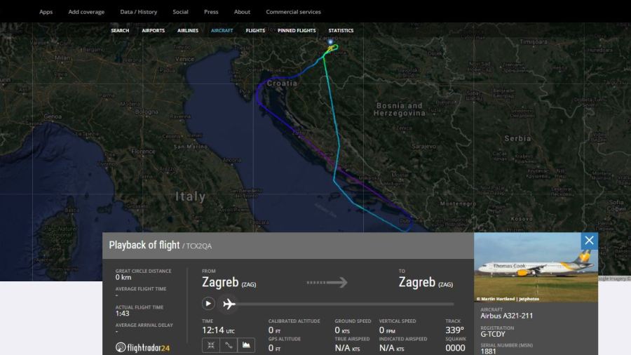 Sektor tehničkih poslova Croatia Airlinesa u Zagrebu imao je u petak, 16. veljače, smjenu zrakoplova britanskog zračnog prijevoznika Thomas Cook Airlines (MT/TCX) na servisu. Nakon probnog leta koji se radi nakon D-checka, odletio je za Manchester zrakoplov tipa Airbus A321 reg. oz. G-TCDY, a istog je dana iza ponoći na servis došao drugi zrakoplov istog tipa reg. oz. G-TCDW. Istovremeno, u petak, 16. veljače, probni let nakon D-checka imao je i zrakoplov Croatia Airlinesa (OU/CTN) tipa Airbus A320, reg. oz. 9A-CTK, i od subote, 17. veljače, ponovno se uključio u redoviti promet.