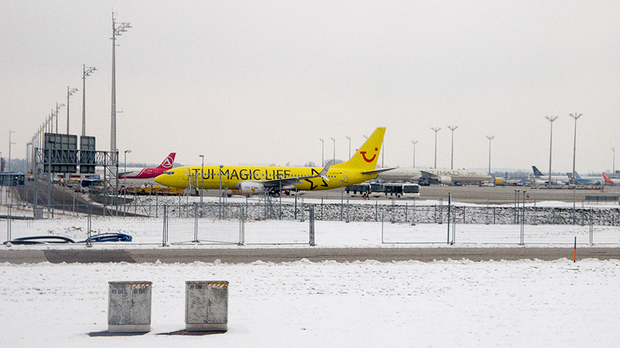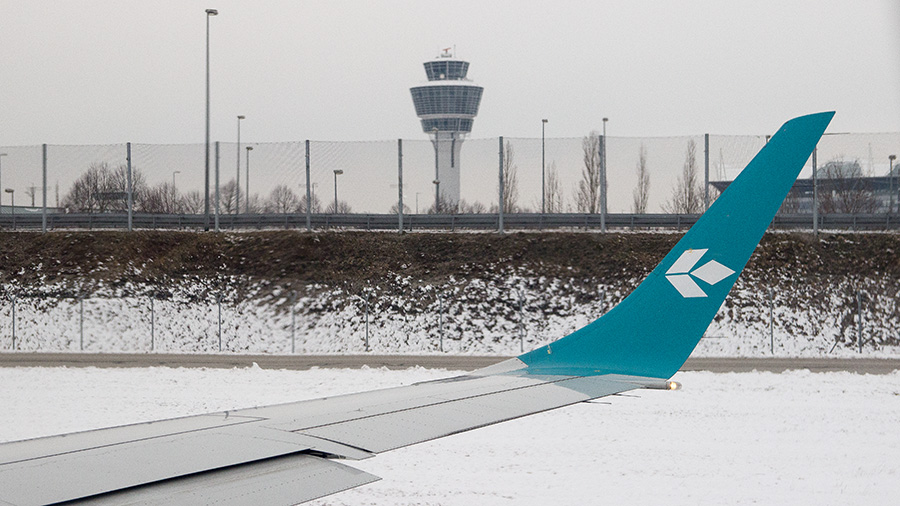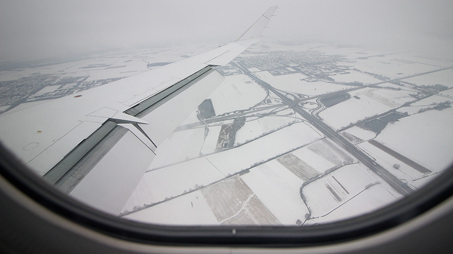 Uskoro smo uronili u oblake i krenuli na prilaz areodromu u Münchenu. Može se odmah reći da tamo ima puno više snijega nego kod nas. Napomenuo sam prije u tekstu da su kasnili zbog slabog snijega, no, sada je on prestao, samo je bilo oblačno.