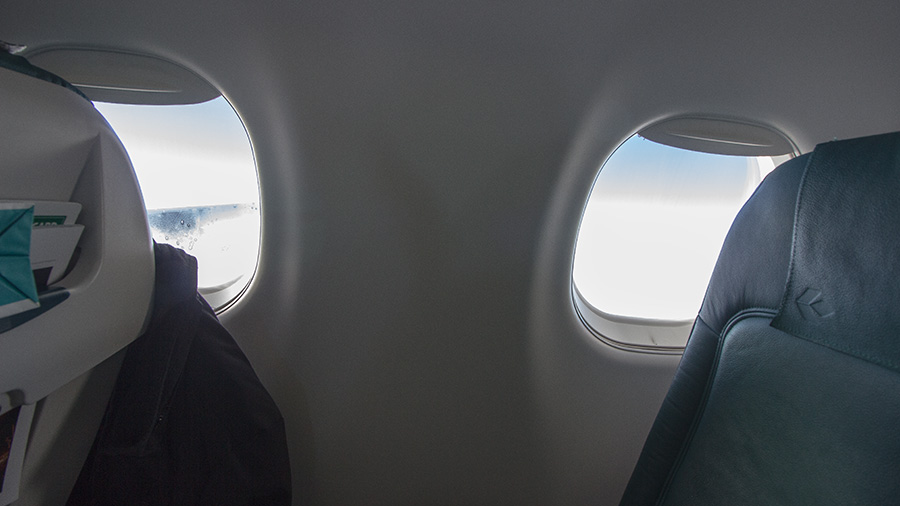 Jeste li primjetili? Ako niste, pogledajte prozore. Dakle, kada sjediš i želiš pogledati van, gledaš ravno u „zid“. Za pogled kroz prozor moraš okrenuti glavu za barem 120° udesno ili se nagnuti naprijed i dijeliti prednji prozor s putnikom pred sobom. Ne možeš zauzeti onaj ugodan proložaj, ono, kad se zavališ u sjedalo i uživaš u pogledu prema van… Sad mogu uživati u pogledu prema „zidu“. No, nije samo moje sjedalo imalo tu privilegiju gledanja u „zid“, primjetio sam da dobar dio sjedala na zadnjem dijelu zrakoplova ima takav pogled.