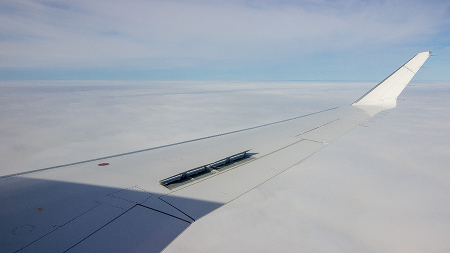 Opet smo slušali domaćice zrakoplova kako nam objašnjavaju standardne procedure u slučaju neželjenih situacija. Također, stanje zainteresiranosti za gledanje njihove prezentacije nije bilo ništa veće od one na prethodnom letu. Zrakoplov je izguran, piloti su pokrenuli motore i krenuli smo prema uzletno sletnoj stazi. Mogao se je vidjeti kontrolni toranj i eto ga na slici uz winglet.