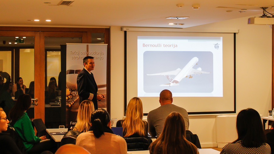 Nakon vježbi opuštanja, predavanje je nastavio cpt. Ivan Klanac, pilot na zrakoplovu tipa Bombardier Challenger 604 s preko 2.500 sati leta. Polaznicima tečaja je objasnio načela leta zrakoplova, kako se njime upravlja, što se točno događa od trenutka polijetanja do slijetanja, zašto se motori ponekad jače čuju, a zašto ponekad tiše, koje su vrste motora, što se sve nalazi u pilotskoj kabini…