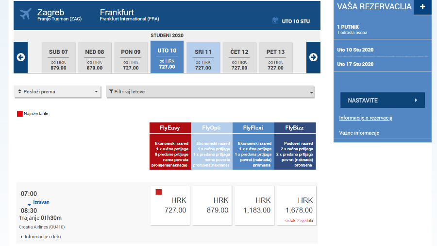 Sad kad smo razjasnili osnovnu razliku između zračne luke i zračnog prijevoznika, vrijeme je vratiti se našem odredištu – Frankfurtu. Za let iz Hrvatske možemo odabrati jednu od gore spomenutih zračnih luka, ovisno koja vam je zemljopisno bliže ili prometno dostupnija. Kako bi bilo jednostavnije za početnike, ovaj put ćemo planirati naš let iz zračne luke Zagreb. Kao bismo znali koji prijevoznici lete s ove zračne luke, posjetit ćemo njenu web stranicu www.zagreb-airport.hr te potražiti tražene informacije. Nakon istraživanja, iz ponuđenog saznajemo kako iz Zagreba za Frankfurt lete dva prijevoznika, njemačka Lufthansa i naša Croatia Airlines. Sljedeći korak je posjetiti stranice prijevoznika kojim želimo letjeti. Ova dva navedena prijevoznika kao i mnogi drugi, dio su saveza Star Allinace te postoji mogućnost da oba na svojom stranicama nude letove oba prijevoznika. Stoga ćemo zbog lakšeg snalaženja i možebitnih jezičnih barijera kartu potražiti na stranici našeg: www.croatiaairlines.com/hr