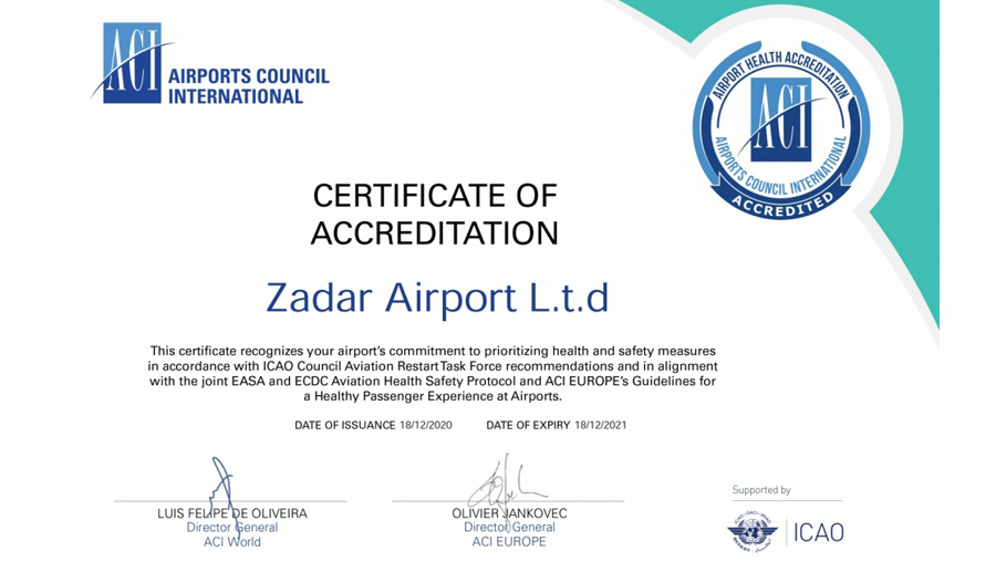 Zadar Airport is accredited in the Airports Council International (ACI) Airport Health Accreditation programme.
