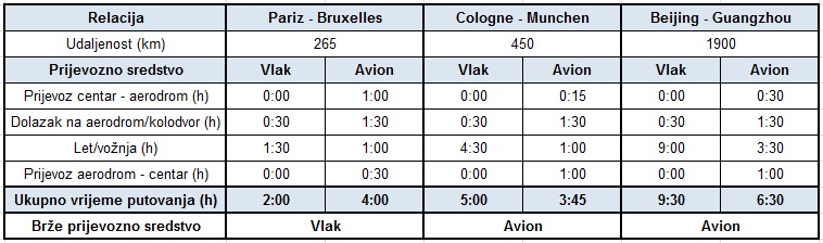 Iz prikazanih primjera može se vidjeti da su željeznice konkurentne do udaljenosti od približno 400 kilometara, a nakon toga dolazi dominacija zrakoplova. U zračnom prijevozu se najviše vremena gubi na prijevozu od centra grada do aerodroma, te na samom aerodromu dok se naprave sve procedure koje se moraju proći od prijave za let, sigurnosnog pregleda do ukrcaja u zrakoplov. Željeznice velikih brzina već su istisnule aviokompanije sa nekih ruta, pošto nije bilo moguće konkurirati brzini željeznica, te njihovoj najvećoj prednosti, a to je što povezuju centre gradova. Obje grane prometa uvidjele su mogućnost međusobne suradnje, no to je već tema za neki od idućih članaka.